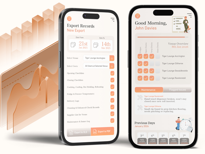Another feature commonly missing from competing apps is a comprehensive management overview. Venue managers can check on logs completed each day to ensure compliance, whereas venue owners can oversee multiple sites at a glance. Exporting records takes 2 taps and diary entries can be viewed at a glance for EHO compliance.